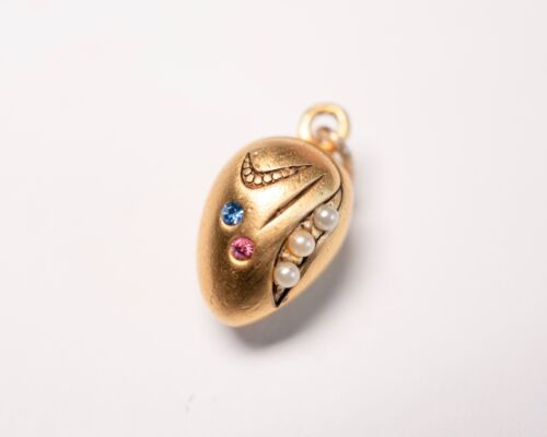 Antique Fabergé Egg Pendent with a Ruby, Blue Sapphire 14K Gold with 3 Pearls
